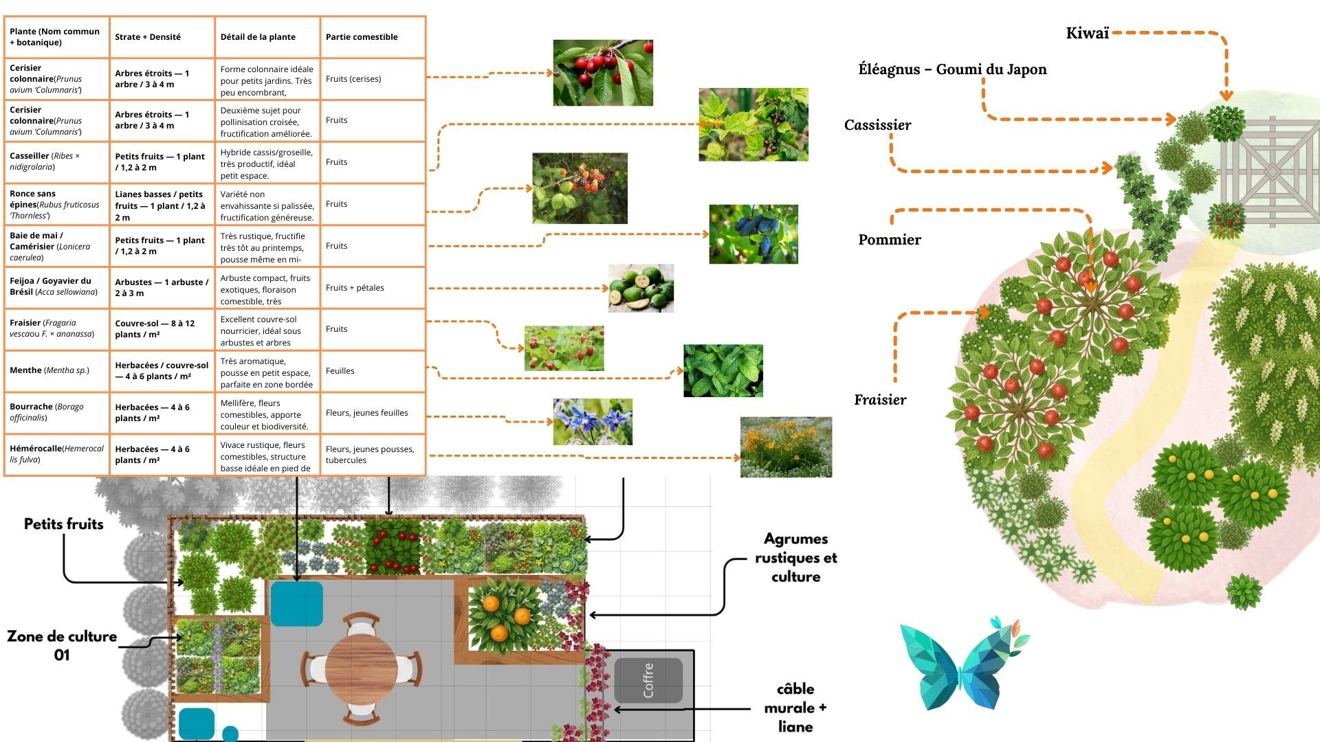 – Strates et guildes (arbres, arbustes, herbacées, couvre-sol, lianes…)